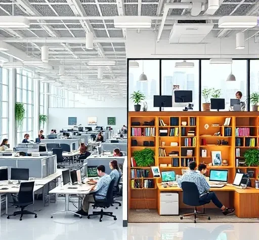 - Меньше персональных рабочих мест: компании переходят к системе hot-desking (общие рабочие места), что уменьшает потребность в выделенных кабинетах.